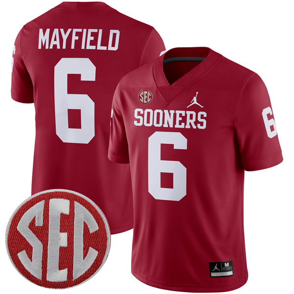 Celebrate Oklahoma pride with the Baker Mayfield Oklahoma Sooners Crimson Home Stitched Jersey w/ SEC Patch, crafted to honor one of OU’s most iconic quarterbacks. Represent the University of Oklahoma and the Sooners in true state spirit with a bold crimson base featuring stitched player name, embroidered number, and finely detailed team logo. This home football jersey carries the energy of game day in Norman, letting fans showcase their dedication to Baker Mayfield and the OU tradition.