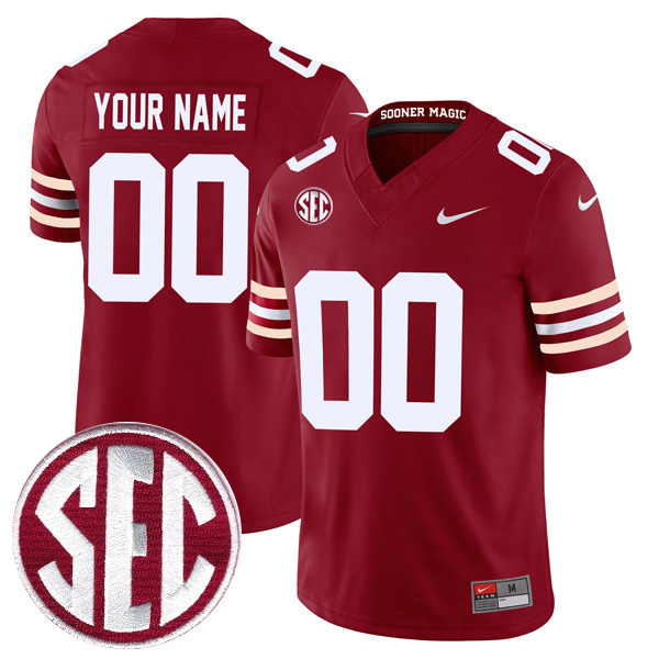 Stand out in Sooners fashion with the Custom Oklahoma Sooners Football Crimson Alternate Game Stitched Jersey w/ SEC Patch, designed to highlight the University of Oklahoma’s strength and tradition. The deep crimson tone represents the OU spirit, while stitched and embroidered details such as player name, number, patch, and logo showcase durability and pride. Celebrate Oklahoma football history and your Sooner State pride with this dynamic alternate game jersey.