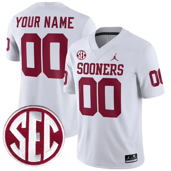 Custom Oklahoma Sooners Football White Away Game Stitched Jersey w/ SEC Patch